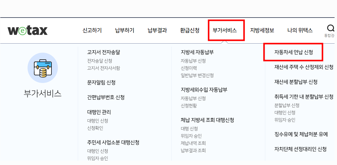 홈페이지에서 '부가서비스 > 자동차세 연납 신청' 메뉴를 통해 쉽게 신청할 수 있어요.